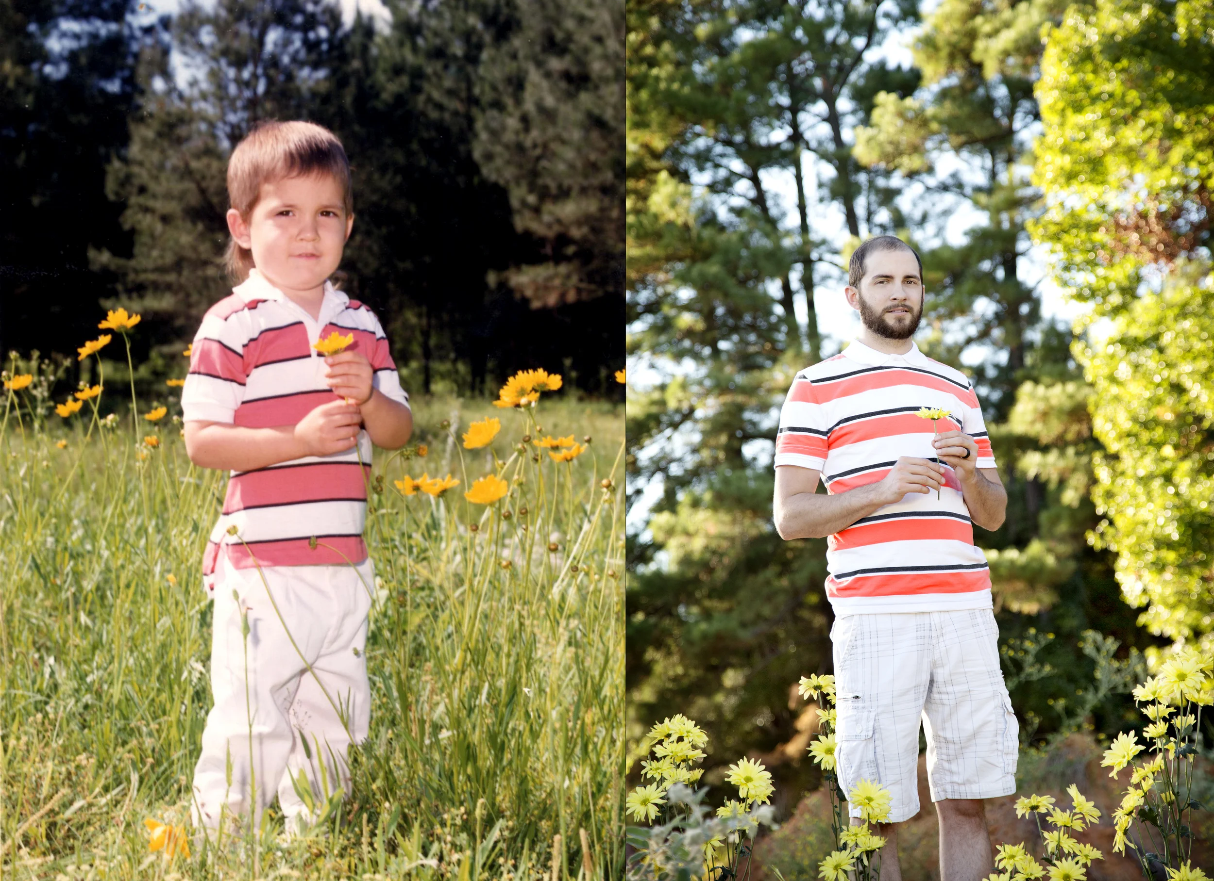 ....Which was all well and good until a few days before our wedding Cory and I realized we didn't actually recreate our baby photos! We are resourceful though and set up a "mini studio" shoot in our living room for my photo and a field behind our house was the optimal setting for Cory's. I edited, printed, matted and barely had time to frame and set up the finished products by the rehearsal, but I am so happy we did.
