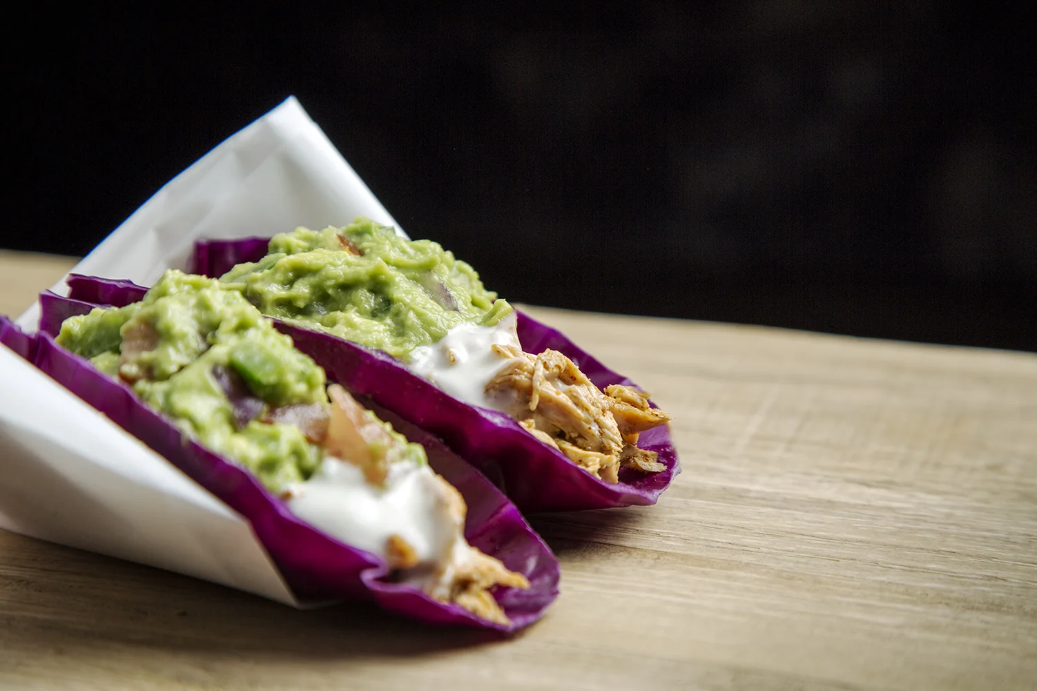 green chili shredded chicken on a cabbage shell with homemade garlic lime sauce and guac. Yeah, place your order today.