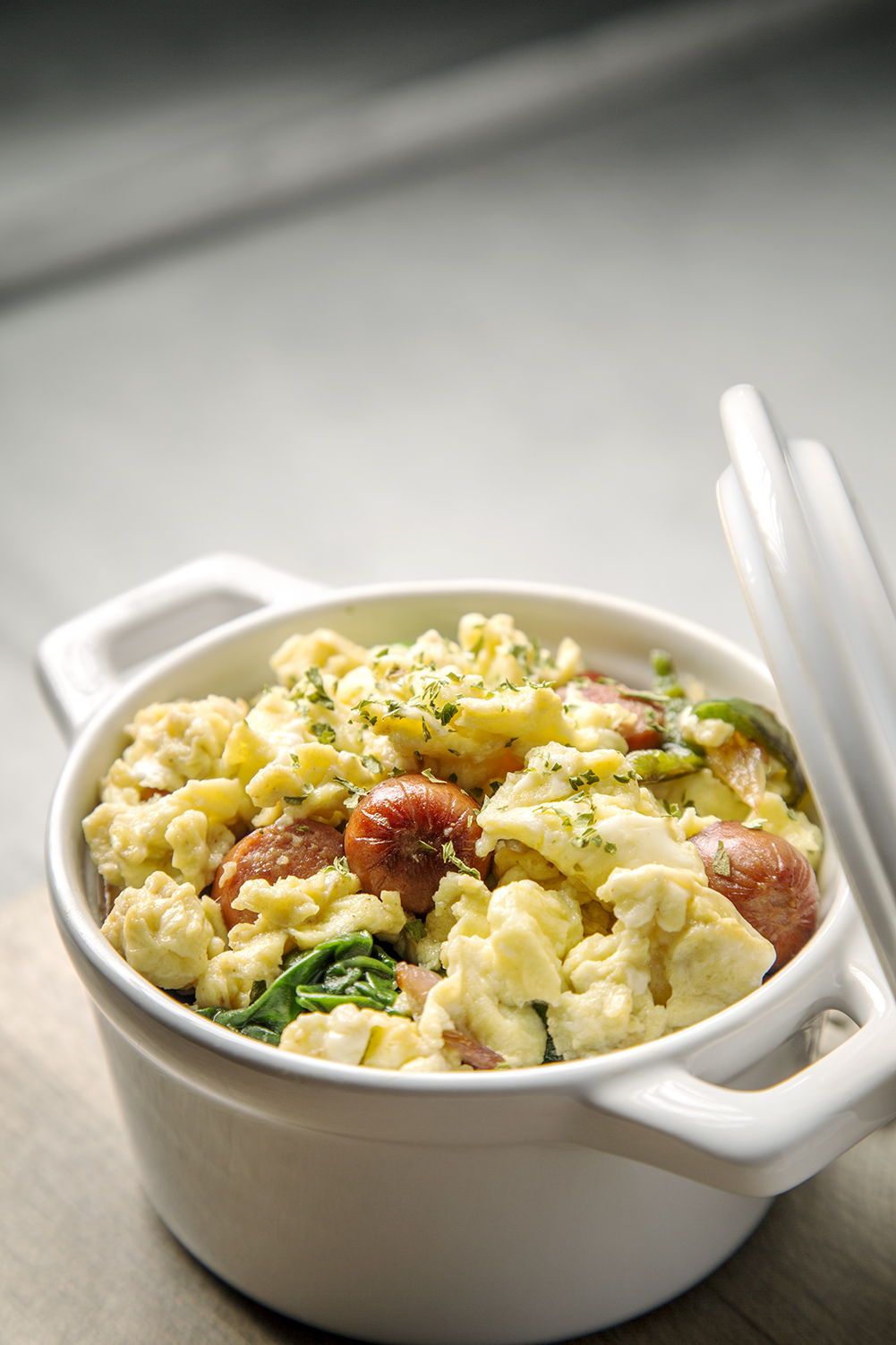 edible. Eggs, winning weiners, spinach and jalapeño.