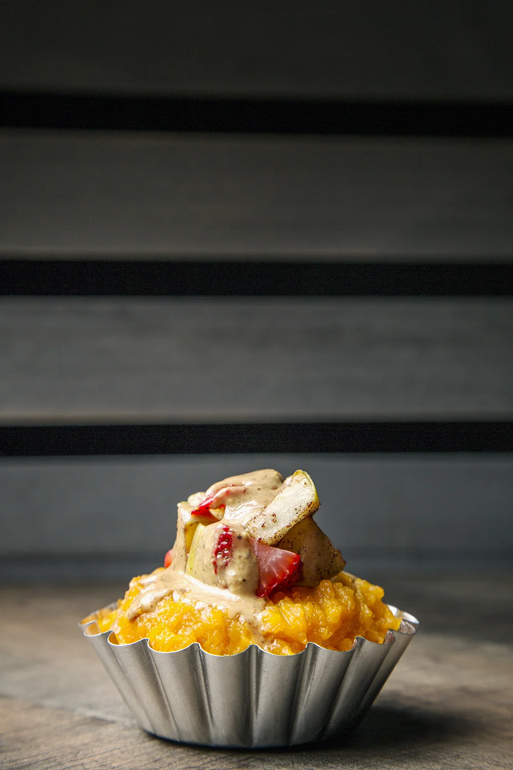 Creamy sweet potatoes with sautéed apples and strawberries. Topped with melted almond butter and cinnamon.